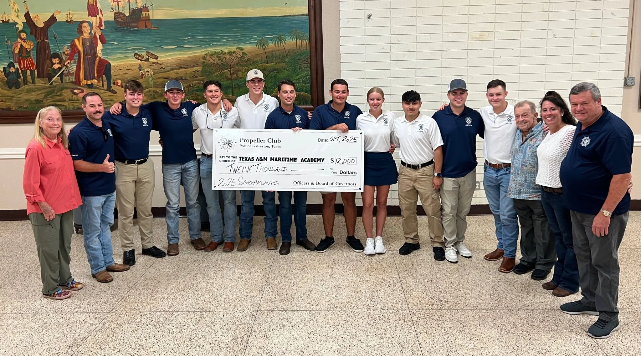 Thanks to our sponsors and membership's generosity and support, the Propeller Club, Port of Galveston on Wednesday, October 15, 2025, was able to present a check for $13,000 to the Texas A & M Maritime Academy Scholarship Fund for 2025. (check pictured was mis-labeled) Pictured are the recipients along with several of our board members. Thank you to our sponsor for the evening, Texas State Senator Mayes Middleton.